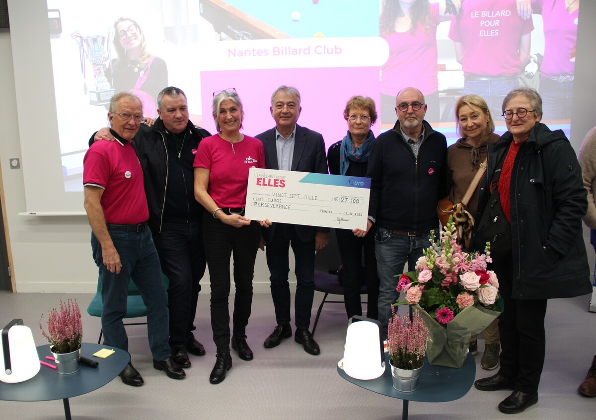 Le Billard Pour Elles : une mobilisation nationale La troisième édition, soutenue par la Fédération Française de Billard , sous le signe de la solidarité et de la générosité a permis de mobiliser, sensibiliser , de faire découvrir un sport non traumatisant et de remettre un chèque de 27 100 € à Persévérance : le fonds de dotation de l'Institut de Cancérologie de l'Ouest. Les fonds permettront d'acquérir un vêlo d'épreuve d'effort et de participer à un projet de recherche Epi-Sport pour Faire de l'Activité Physique Adaptée une arme contre le cancer. Des initiatives de plus en plus nombreuses et des expériences inspirantes dans des domaines variés. Enjeu, Avenir, Espoir , Générosité , Fédérer : 5 mots choisis pour résumer la table ronde (44 minutes, à visionner ici ) qui a précédé la remise de chèque sur le thème : « Quand le sport devient un levier de santé, d'innovation et de solidarité » On continue à se mobiliser dès à présent pour faire de la 4ème édition un nouveau succès : embarquez avec nous ! L'expérience a prouvé que chacun à son niveau peut participer et ainsi contribuer au rayonnement du Billard Pour Elles. Merci à tous.