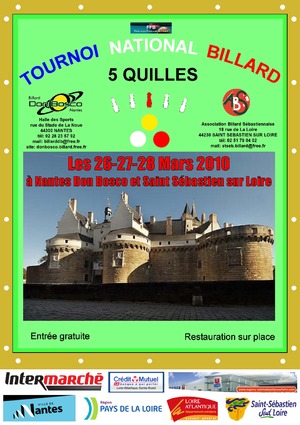 Les compétitions se dérouleront à la fois à Nantes, salle de Don Bosco, et à Saint-Sébastien, 18 rue de la Loire (02.51.79.04.02) Inscriptions: Du jeudi 11 fév 2010 - 18:00:00 au jeudi 4 mars 2010 - 18:00:00 Hébergement: liste d'hôtels Restauration à la buvette de la salle: Brioches, amuse-gueules, cannelés, sandwiches, quiches, huitres, salade piemontaise, taboulé ... Site:http://donbosco.billard.free.fr/html/nat5quilles.php